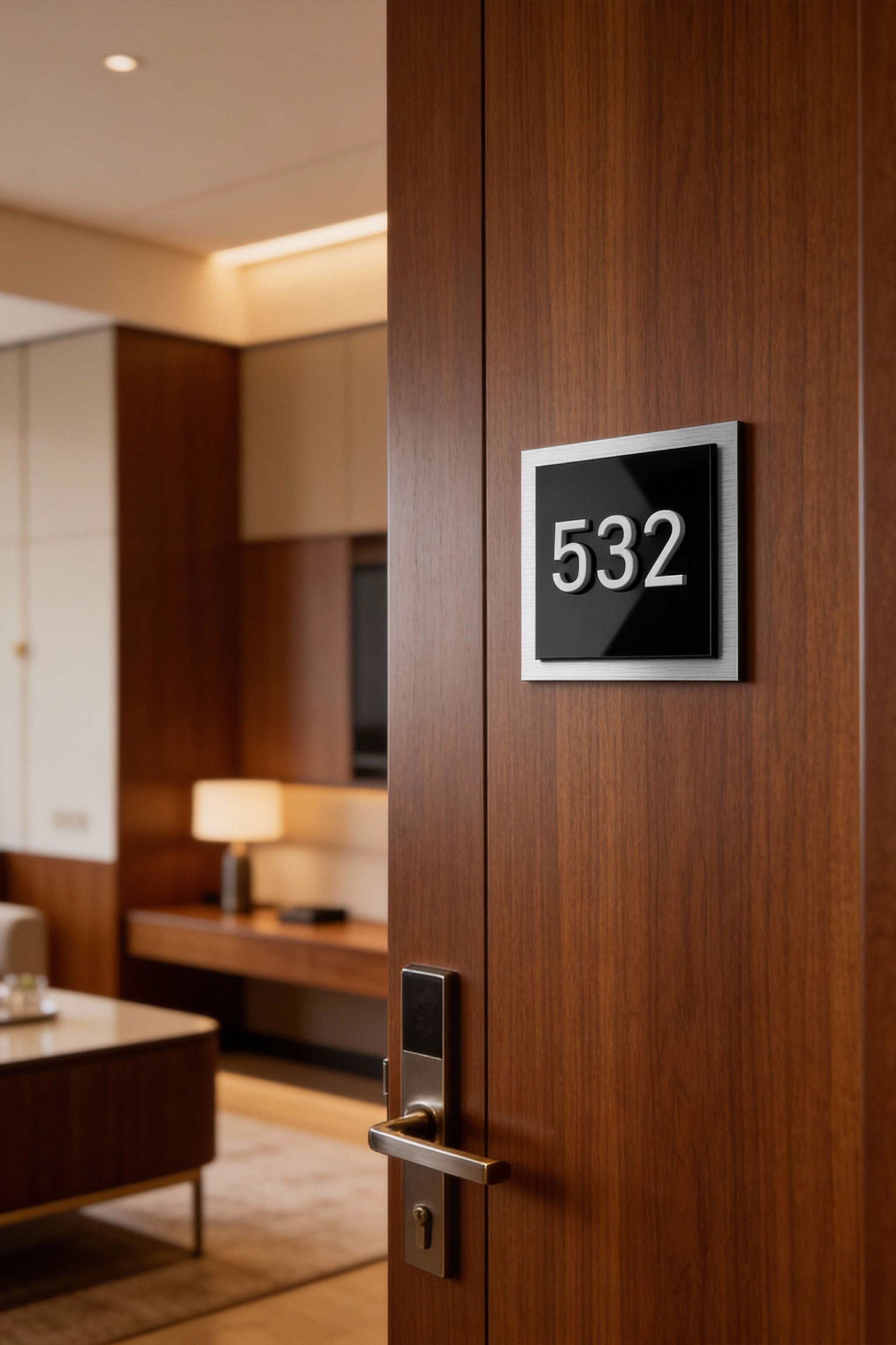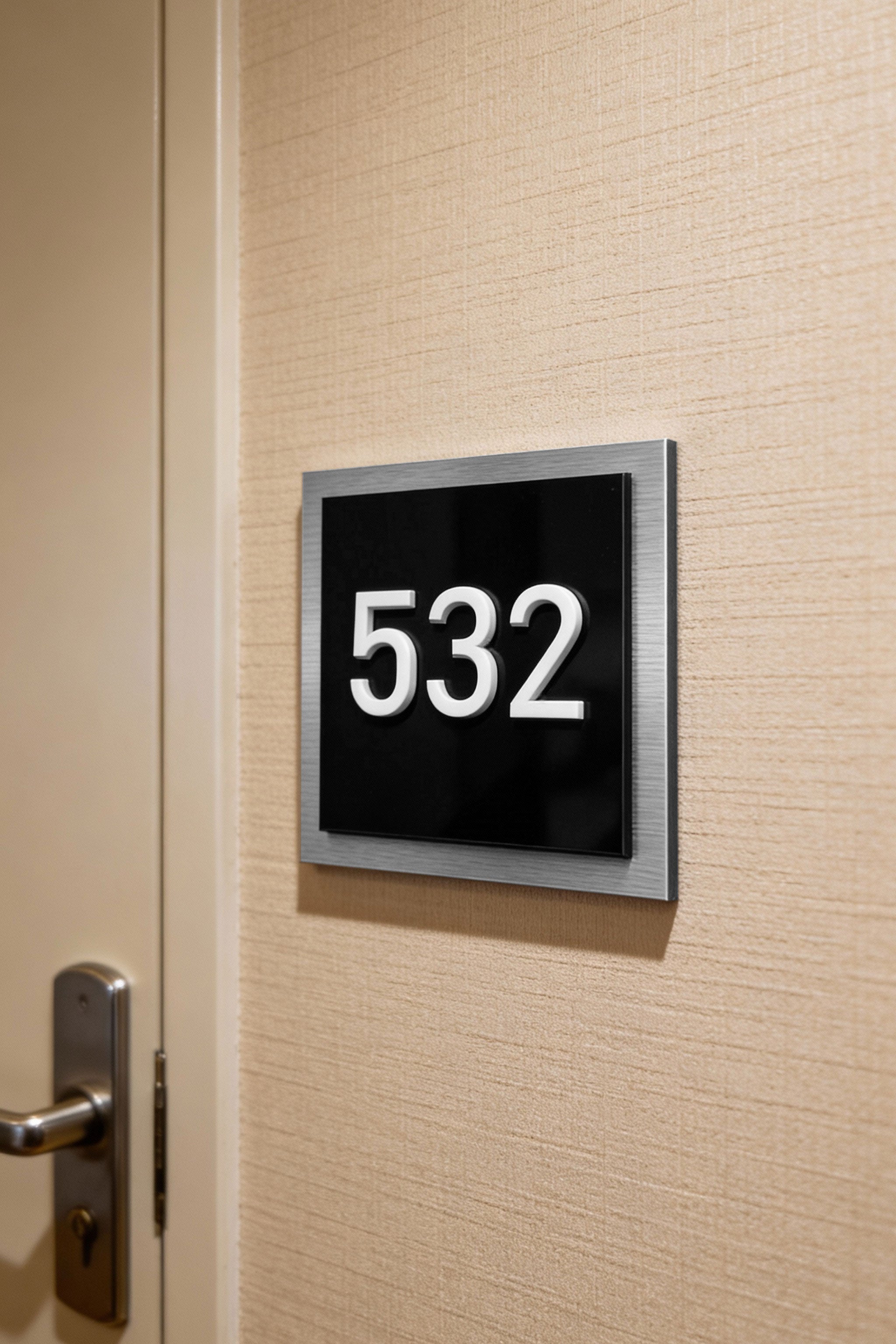 Available in five sizes and customizable with up to 5 characters, this sign is ideal for apartment numbers, hotel room numbers, suite labels, and custom interior numbering systems. Its premium materials and layered black-and-white contrast make it a versatile and stylish signage choice for luxury interiors.