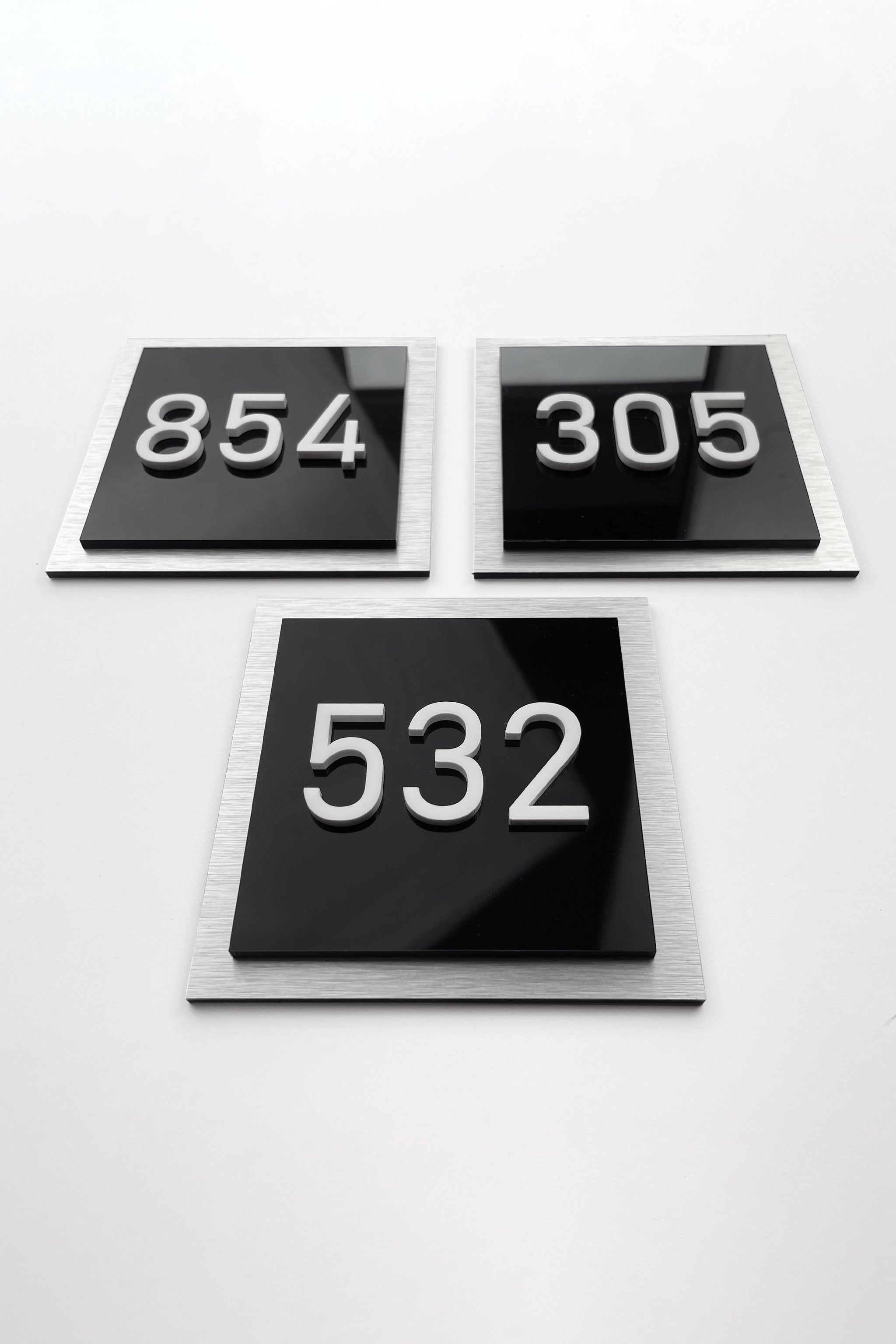 Each sign is made from durable indoor materials selected for long-lasting quality and premium presentation. The brushed silver aluminium plate provides a clean architectural base, while the black acrylic glass layer enhances contrast and structure. The white glossy acrylic letters and numbers create a striking 3D effect that improves readability and gives the sign a refined high-end appearance.