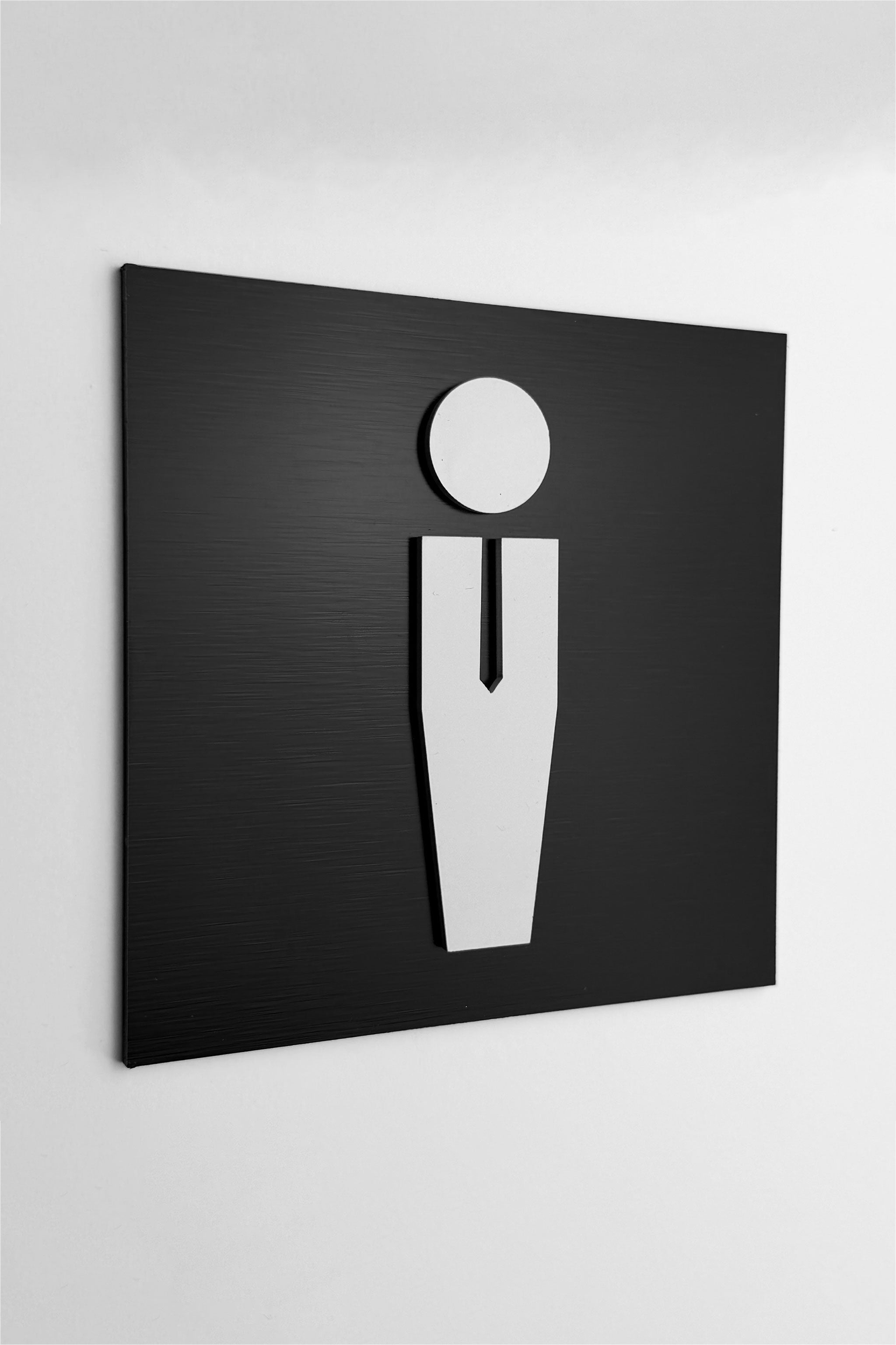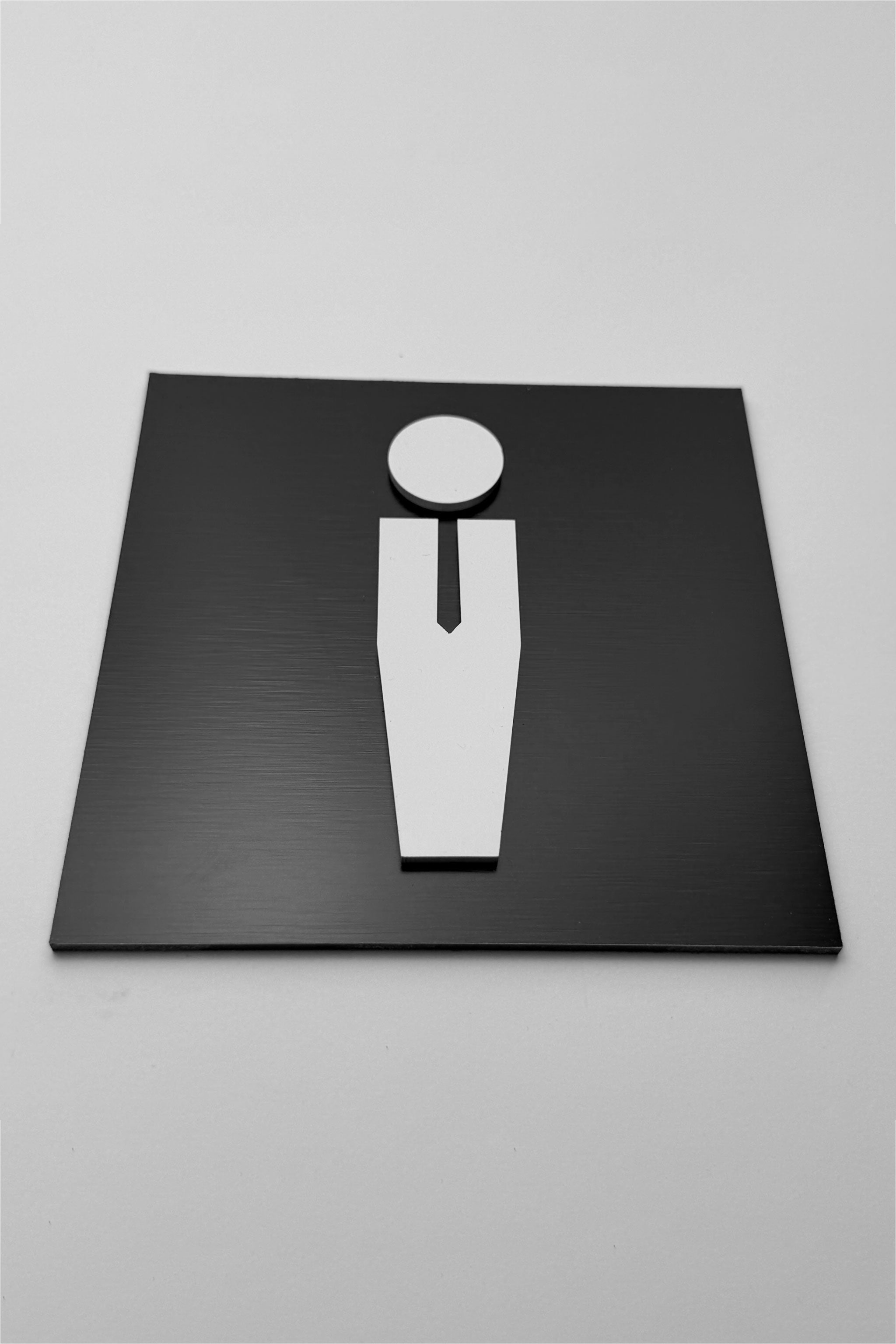 Available in three premium finish options, this stylish men’s restroom sign is crafted from a brushed silver aluminium plate with black acrylic glass symbol, a brushed bronze aluminium plate with black acrylic glass symbol, or a brushed black plate with glossy white symbol. Each finish offers a professional appearance and a layered 3D effect that enhances visibility while complementing upscale interior design.