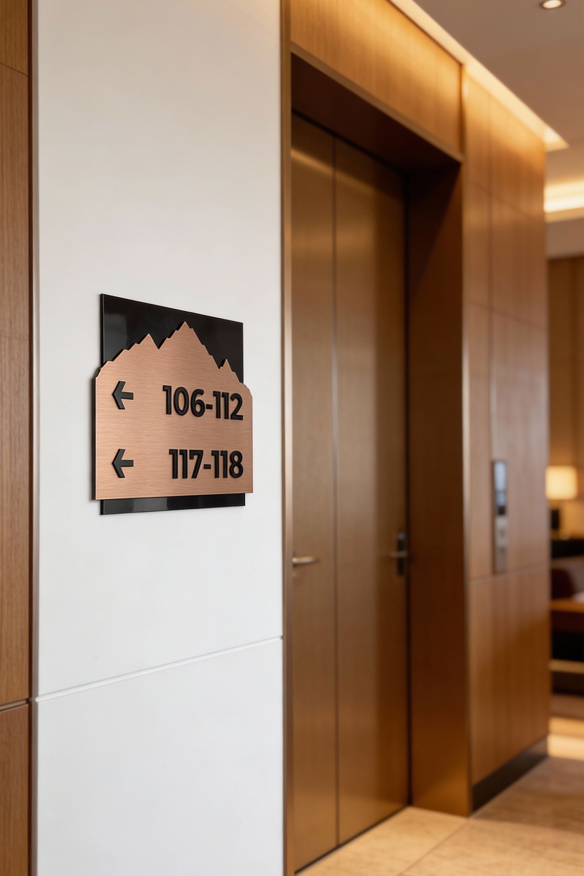 This material combination works beautifully in boutique hotels, reception areas, corridors, office interiors, lift zones, and public spaces where navigation should feel clear yet visually integrated into the design. The result is premium hotel signage that supports both functionality and interior consistency.