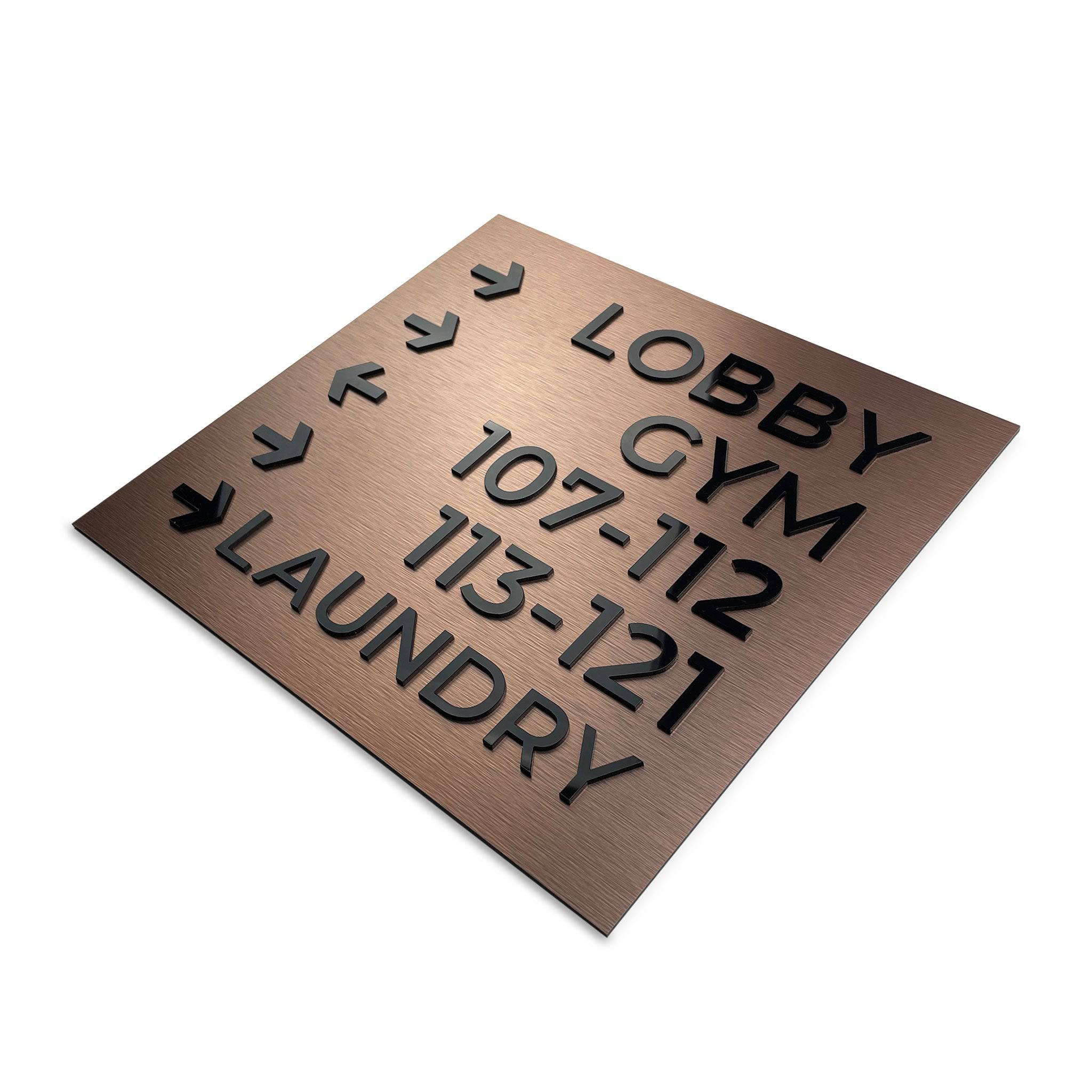 Mejore la experiencia de los huéspedes con nuestra señalización de orientación premium para hoteles, fabricada con un compuesto de aluminio bronce de alta calidad y sofisticado vidrio acrílico negro. Diseñada para ofrecer tanto durabilidad como estilo, esta señal garantiza una orientación clara en todo el hotel, mejorando el recorrido general de los huéspedes.