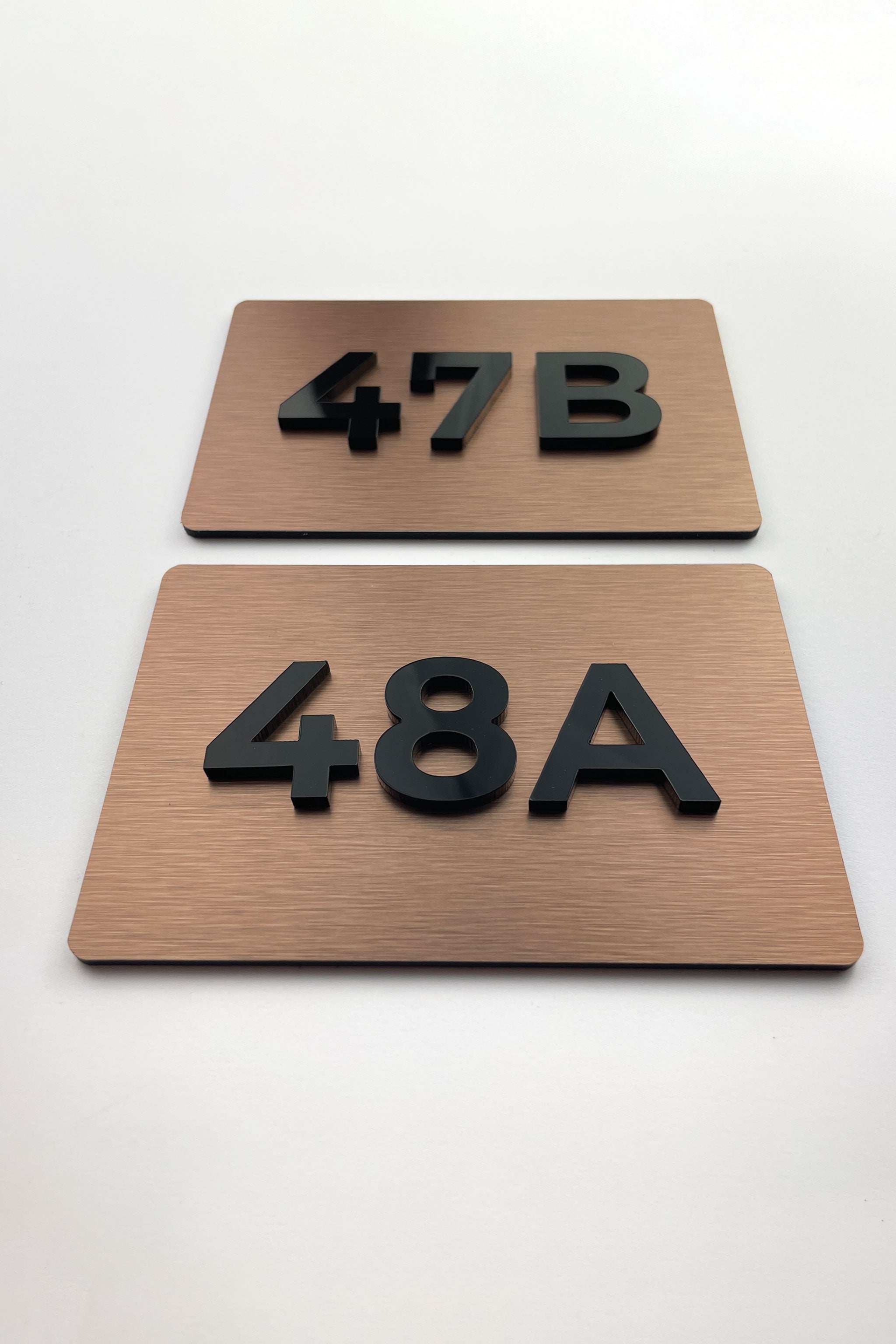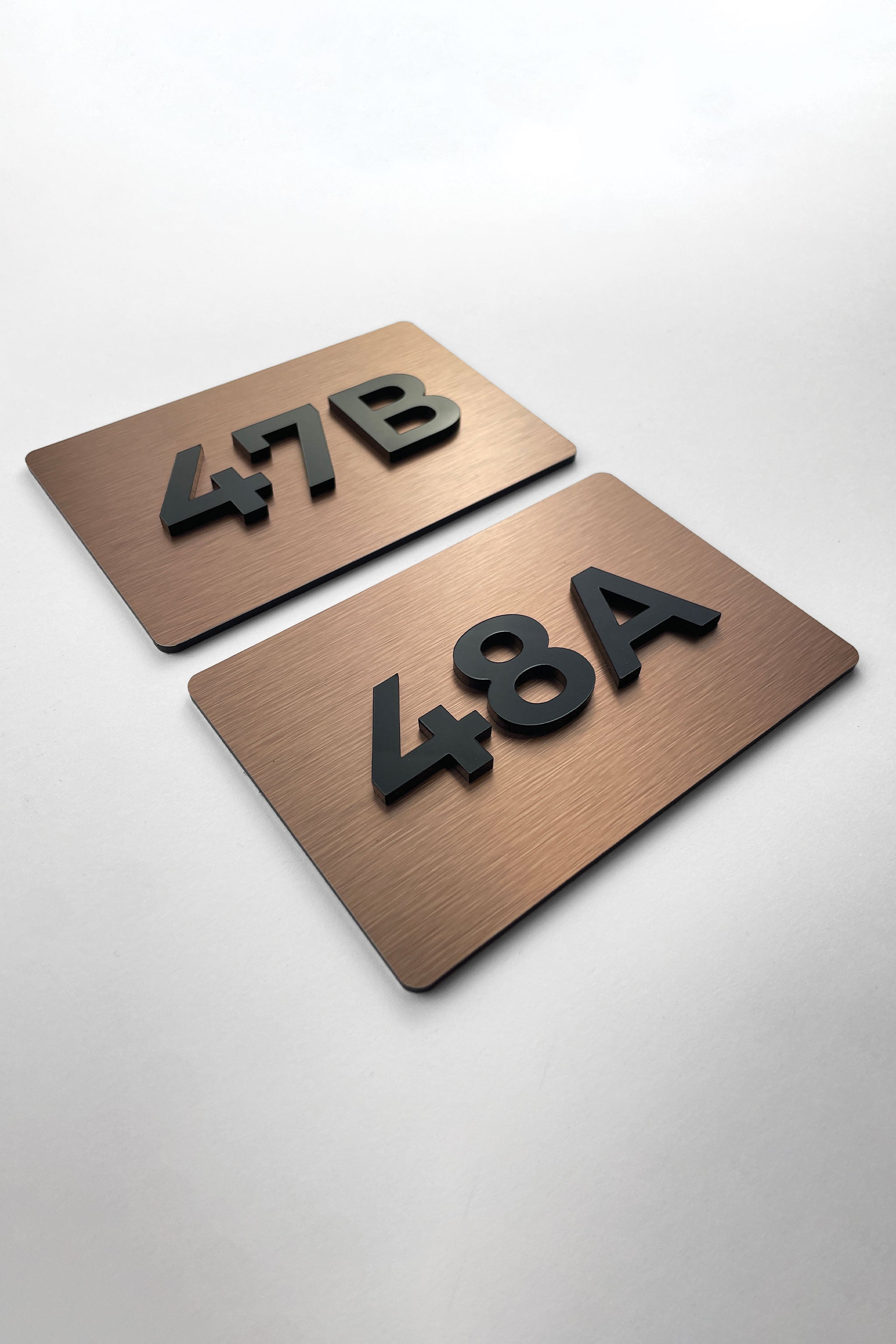 Each sign is made from durable indoor materials selected for long-lasting quality and premium presentation. The brushed bronze aluminium plate provides a sleek architectural base, while the black acrylic glass letters and numbers create a strong layered effect that improves visibility and gives the sign a refined 3D appearance.