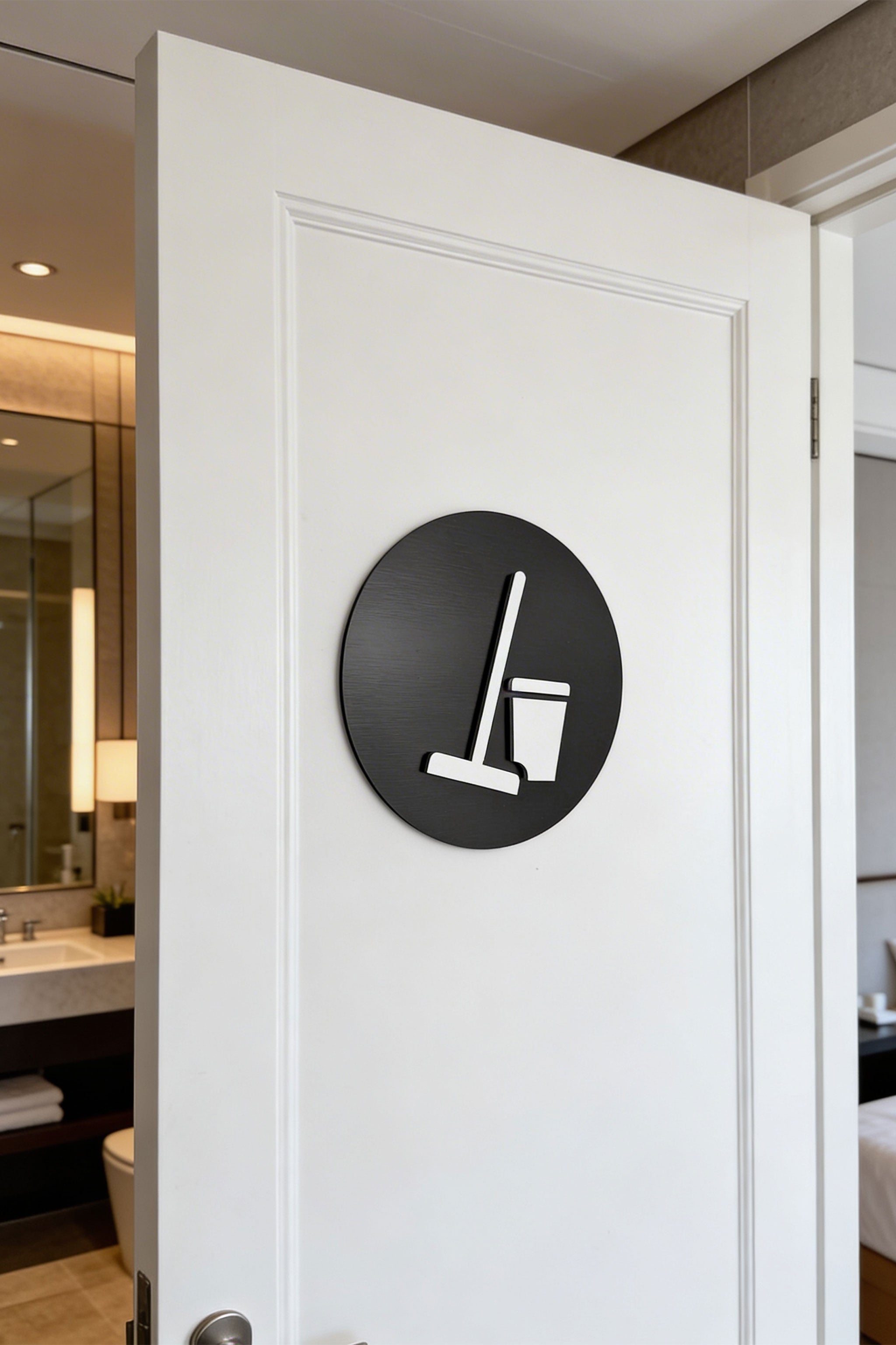 With its balanced square format and minimalist styling, this hotel room cleaning sign is especially suitable for housekeeping areas, hotel service rooms, laundry spaces, supply rooms, and professional back-of-house interiors. It offers a clean and stylish signage solution for environments that value both function and modern aesthetics.