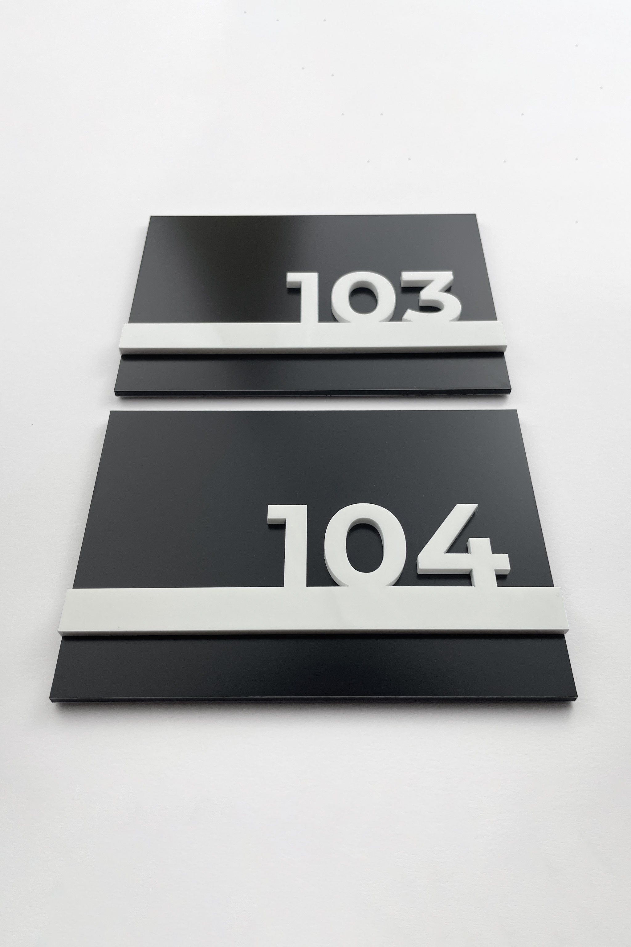Each sign is made from durable indoor materials selected for long-lasting quality and premium presentation. The black aluminium plate provides a clean architectural base, while the white acrylic glass letters and numbers create a strong layered effect that improves visibility and gives the sign a refined 3D appearance.